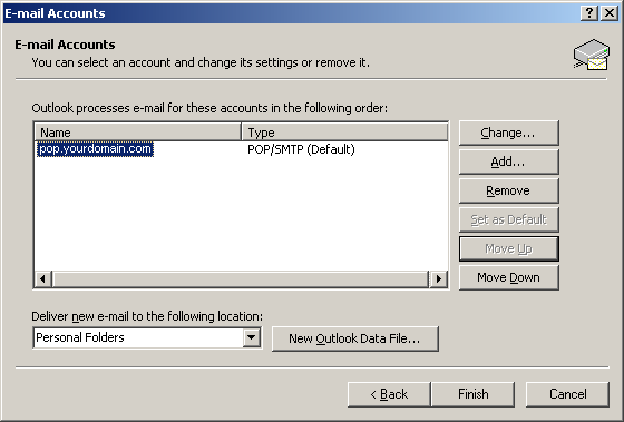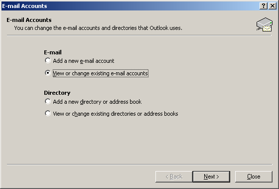 Open Outlook. Click on Tools, then E-mail Accounts at the top of the window. The E-mail Accounts tab may not show immediately, click on the arrows in the drop down part to expose the rest of the tabs.