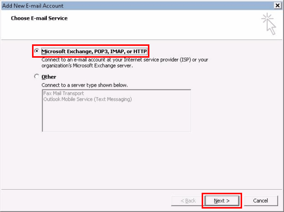 Select the option "Microsoft Exchange, POP3, IMAP, or HTTP" and click the "Next" button.
