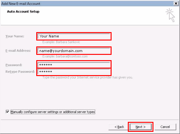 Enter your email address i.e. name@yourdomain.com in the "User Name" field .