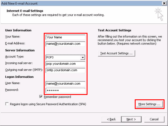 Type in "smtp.yourdomain.com" in the "Outgoing mail server" field.