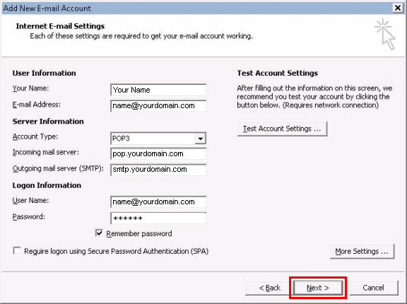 This will return you to the Internet E-mail Settings window. Click the "Next" button.