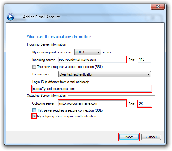 Type in "pop.yourdomainname.com" in the "Incoming mail server" field.