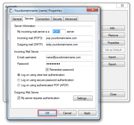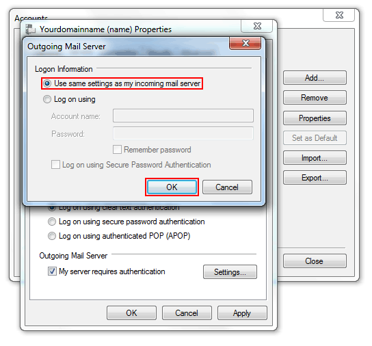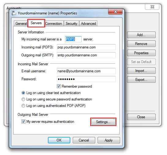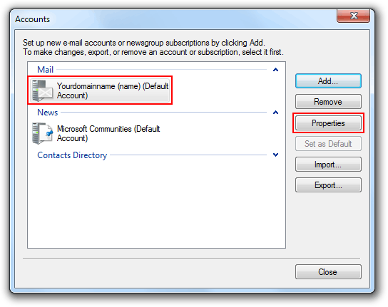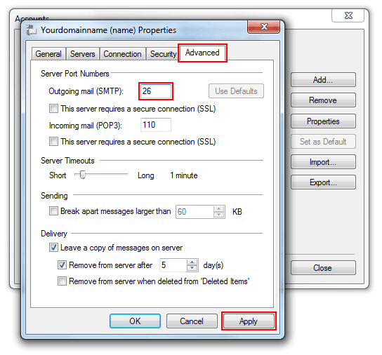 In the Properties window, click on the "Advanced" tab. Under "Server Port Numbers", in the "Outgoing mail (SMTP):" field, type in "26" and then click "Apply".