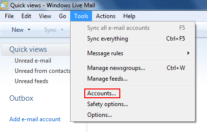 Click on "Tools", then "Accounts" at the top of "Windows Live Mail".
