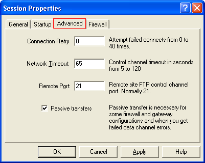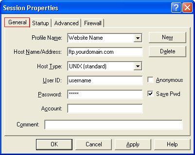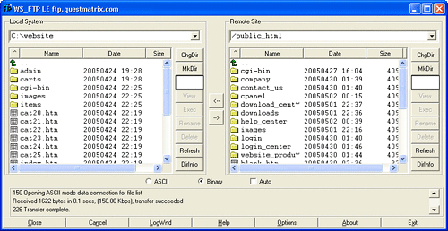 You will see two radio buttons below the display windows, one labeled Binary and one labeled ASCII. There will also be a check box labeled Auto. If you select Auto WS_FTP will automatically apply the correct setting, either Binary or ASCII to the document you are transferring. If you elect not to use the Auto setting please note that it is very important to transfer images in Binary mode. Everything else, HTML documents, cgi scripts etc. should be transferred using ASCII mode. If you fail to set this correctly your files may not appear as they should.
